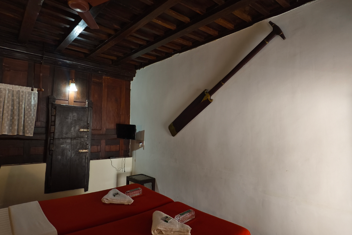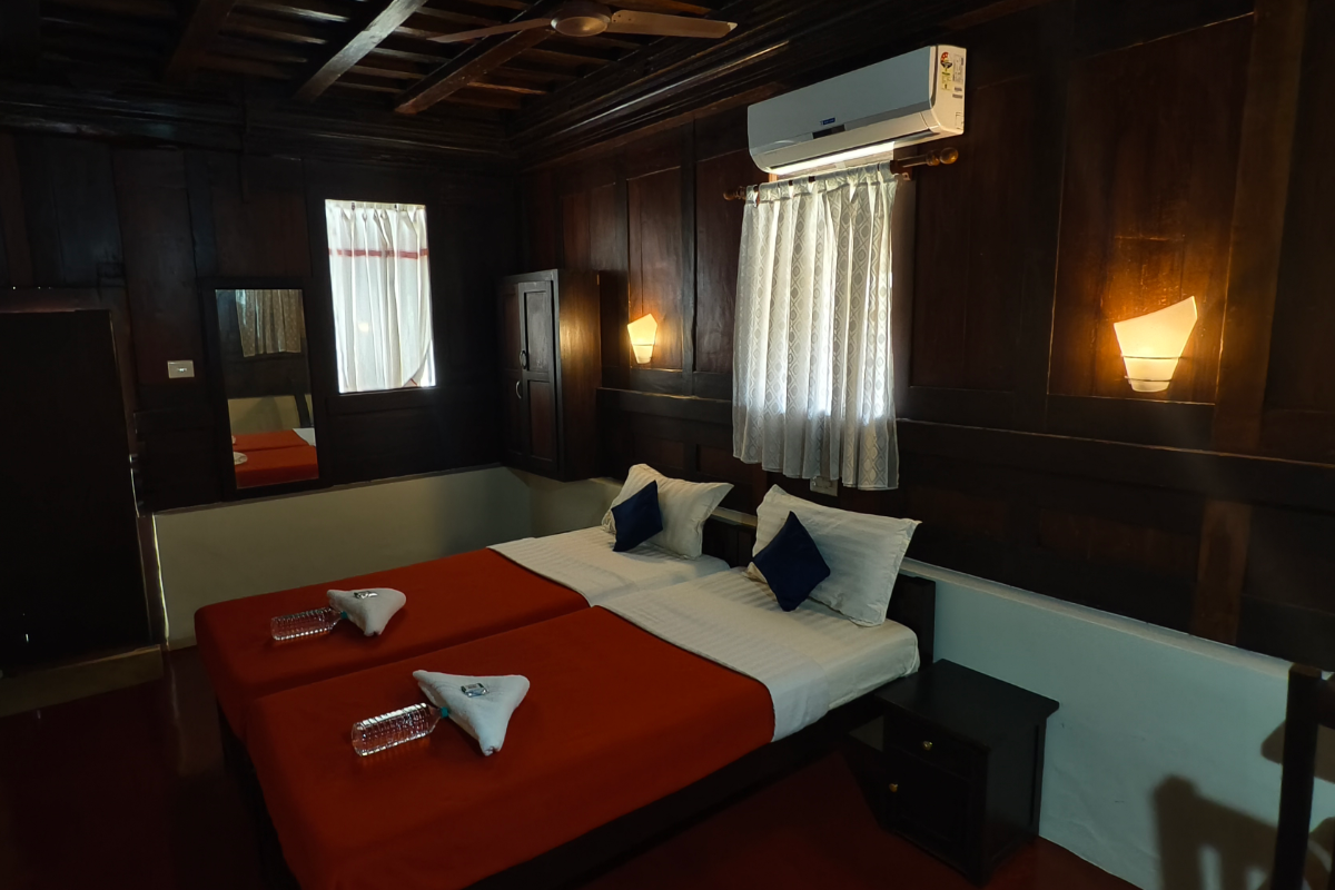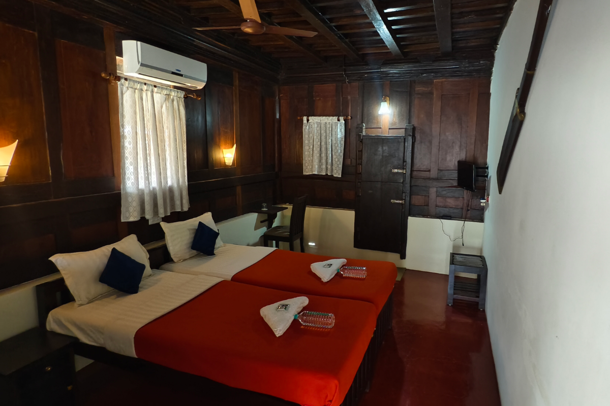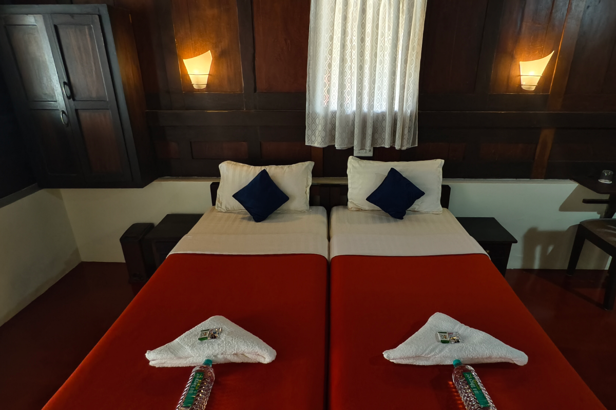 Our Garden View Room offers a perfect blend of Kerala’s traditional charm and modern luxury. This spacious double-bed room overlooks our lush garden, creating a serene and refreshing atmosphere. The interiors feature elegant wooden wall and roof panels that reflect timeless craftsmanship. Enjoy modern comforts including air conditioning, a flat-screen TV, high-speed Wi-Fi, and a well-designed work desk for your convenience. The highlight of the room is its beautiful open bathroom, thoughtfully designed to offer privacy while connecting you with nature. Ideal for relaxation or a quiet retreat, this room ensures a warm, luxurious, and memorable stay at Zoukya.